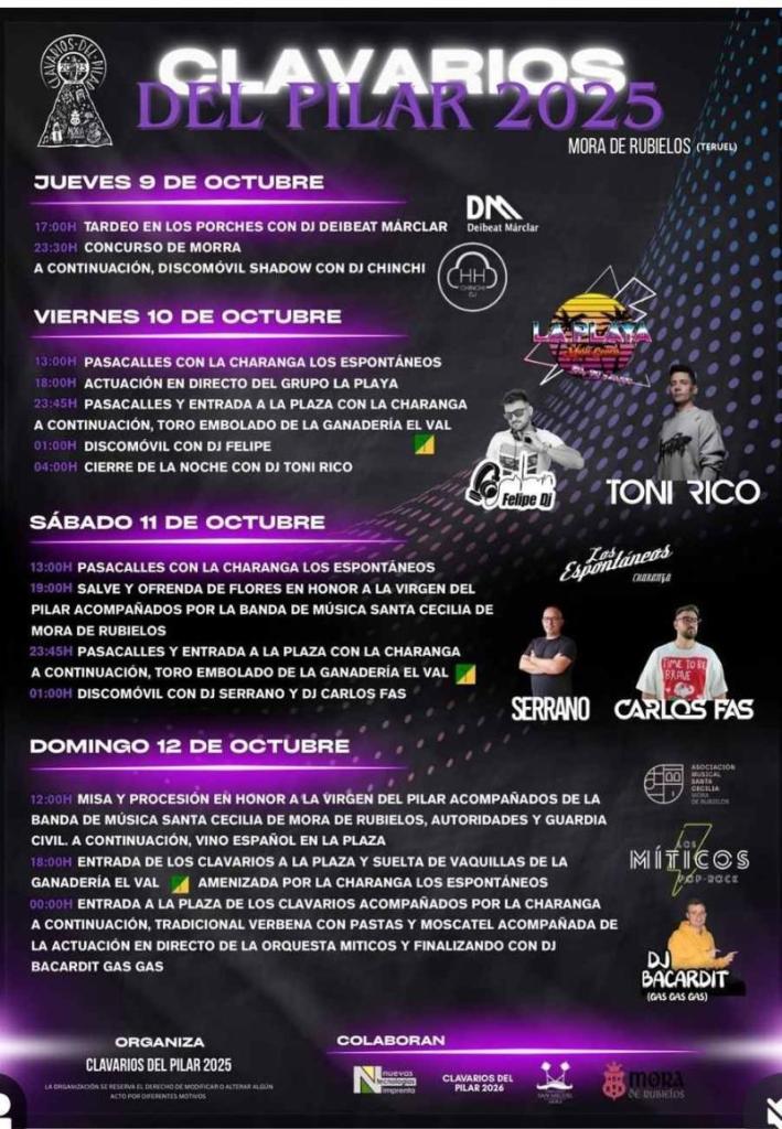 Aquí vas a conocer el programa completo de las fiestas de Clavarios del Pilar 2025, en Mora de Rubielos, entre los días 9 y 12 de octubre.